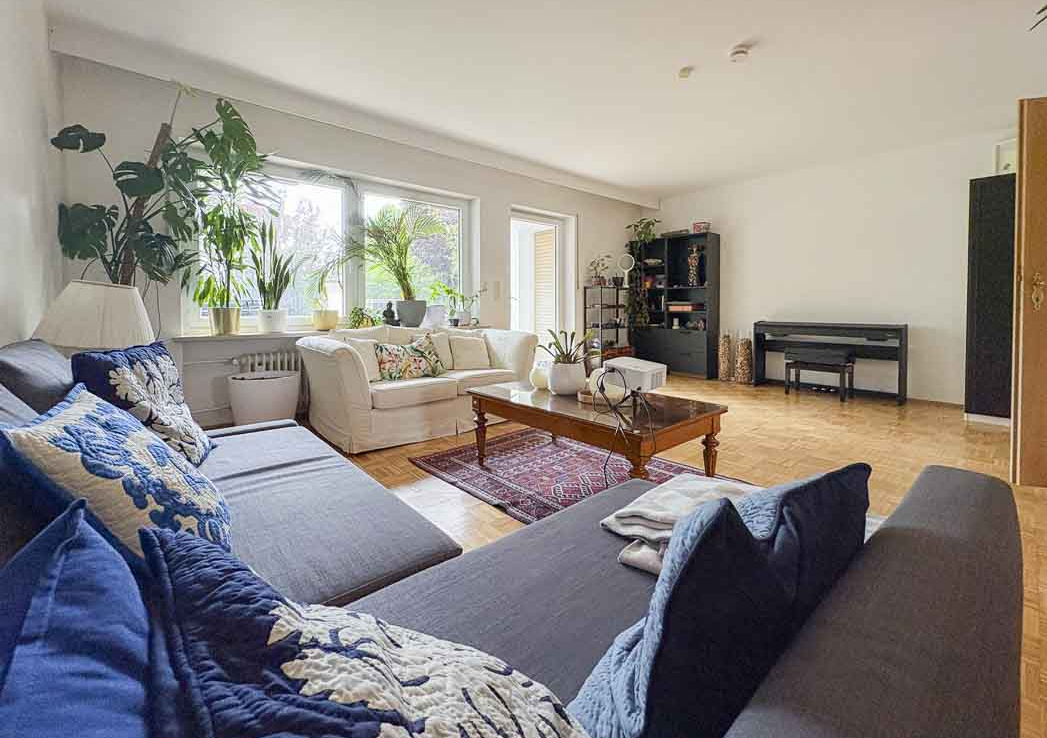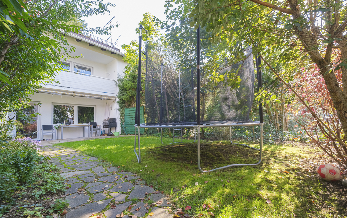 Das mit Stäbchenparkett ausgestattete Wohnzimmer ist super geschnitten und bietet Ihnen einen schönen Blick über die SüdWestTerrasse und ins Grüne. Die große teilüberdachte Südwest Terrasse ist wunderbar groß und den ganzen Nachmittag und Abend Sonnenbeschienen. Der schön angelegte Garten ist einfach ein Traum,